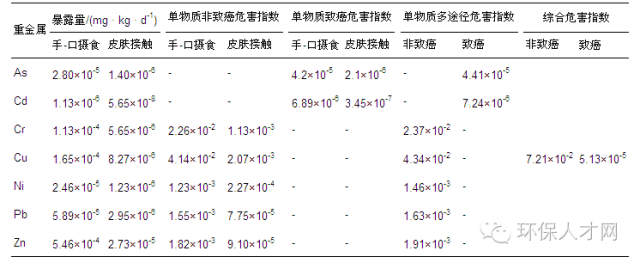 基于健康風(fēng)險(xiǎn)評(píng)價(jià)模型及相關(guān)參數(shù)指標(biāo),利用污泥中重金屬檢測結(jié)果對(duì)污泥的重金屬健康風(fēng)險(xiǎn)進(jìn)行評(píng)價(jià),兒童健康風(fēng)險(xiǎn)評(píng)價(jià)結(jié)果與成人健康風(fēng)險(xiǎn)評(píng)價(jià)結(jié)果分別如表 9和表 10所示.對(duì)于目標(biāo)暴露人群為兒童,以手-口攝食為暴露途徑時(shí),單一物質(zhì)非致癌危害指數(shù)高的元素是Cu,危害指數(shù)為1.21×10-1;以皮膚接觸為暴露途徑時(shí),單一物質(zhì)非致癌危害指數(shù)高的元素同樣是Cu,其危害指數(shù)為1.51×10-3,各重金屬對(duì)非致癌風(fēng)險(xiǎn)貢獻(xiàn)率從高到低的順序是Cu > Cr >Zn> Pb > Ni.污泥重金屬非致癌綜合危害指數(shù)為2.02×10-1,致癌綜合危害指數(shù)為1.44×10-4,其中,以手-口攝食為暴露途徑時(shí),其非致癌與致癌風(fēng)險(xiǎn)分別是2.00×10-1和1.42×10-4,以皮膚接觸為暴露途徑時(shí),其非致癌與致癌風(fēng)險(xiǎn)分別是2.62×10-3和1.78×10-6,手-口攝食暴露途徑為主要的暴露途徑.本次污泥金屬健康風(fēng)險(xiǎn)評(píng)價(jià)研究中,非致癌綜合危害指數(shù)為1.09×10-1,并未達(dá)到非致癌風(fēng)險(xiǎn)警戒值“1”,對(duì)于兒童來說并不存在非致癌風(fēng)險(xiǎn);污泥重金屬致癌綜合危害指數(shù)為1.44×10-4,超出USEPA提供的可接受區(qū)間(1×10-4 ~ 1×10-6),存在一定的致癌風(fēng)險(xiǎn).但需要指出的是,為了揭示大的致癌風(fēng)險(xiǎn)值,該研究是假設(shè)長期生活在布滿污泥的環(huán)境中,因此,實(shí)際生活中,可能并不存在致癌風(fēng)險(xiǎn).