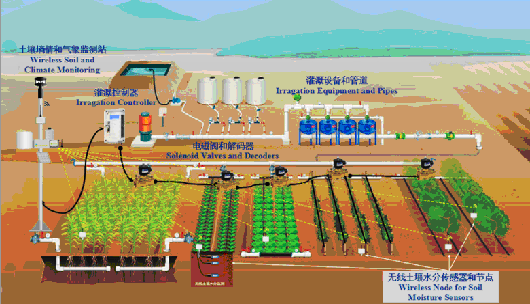 該系統主要由監控中心、通信網絡、遠程監測設備和土壤墑情檢測設備四部分構成。